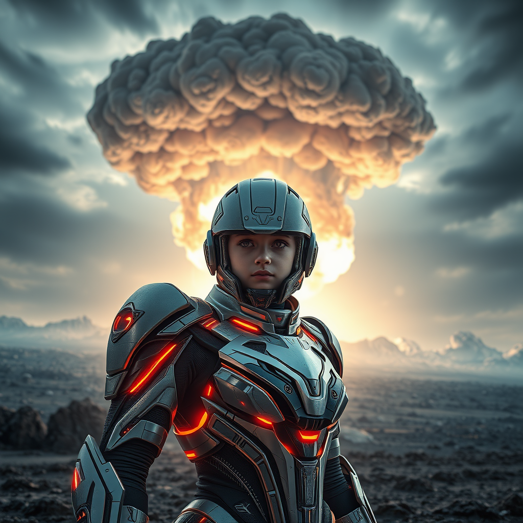 A full-body portrait of a girl in an advanced exo suit emerges amidst a futuristic backdrop. The sci-fi armor gleams with intricate details as a nuclear explosion dominates the horizon, casting an intense blast wave and swirling nuclear ash into the air. The scene captures the raw power of atomic fission with hyper-realism in a cinematic 8K UHD style. The moment is frozen like a movie still, where complex lighting and a long exposure introduce a dynamic sense of speed and acceleration. It feels both like a high-definition photograph and a masterful painting, with the futuristic elements staged dramatically, capturing the clash between technology and natural catastrophe from a third-person view. The atmosphere is infused with a theatrical flash of light, enhancing the scene’s dramatic impact.