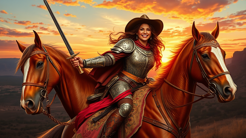 A full-body portrait of a joyful, smiling woman dressed as a cowgirl-knight hybrid, riding a majestic horse. Her attire blends Western elements with medieval armor, adorned with intricate patterns reminiscent of a Venetian carnival. She's engaged in a playful battle, the scene illuminated by a breathtaking sunset, casting warm hues across the landscape. The painting, vibrant in hyper-realistic detail, evokes the dynamic style of Frank Frazetta, capturing the energy and charm of the moment in an exquisite oil painting.