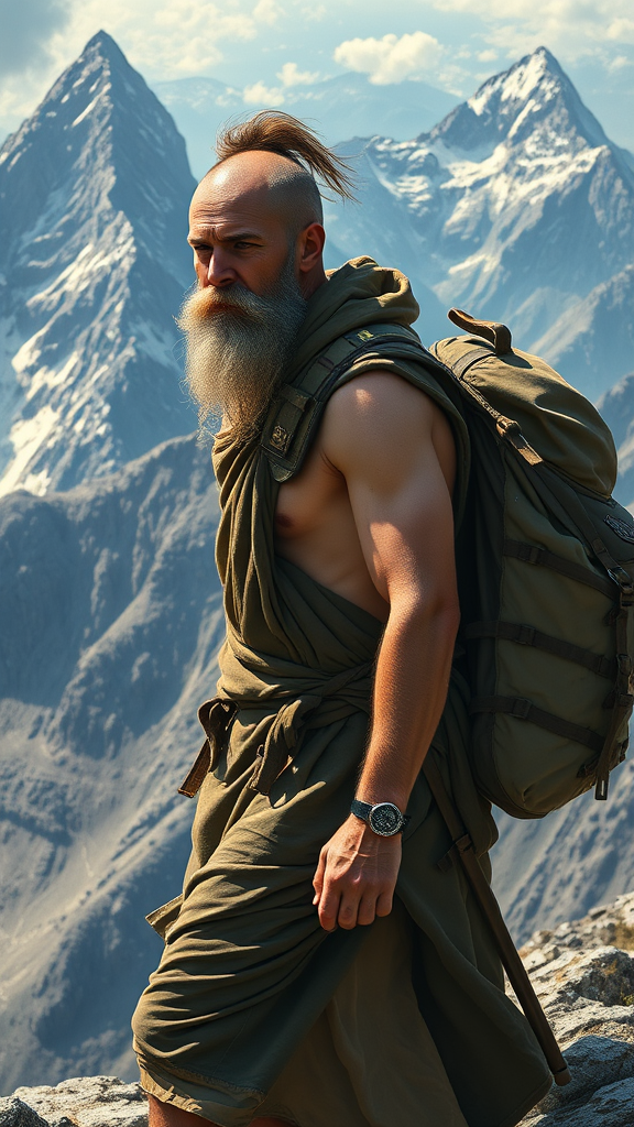 A full-body portrait of a lean, muscular male monk with a weathered rucksack, infused with the aura of a seasoned traveler. He is shown in the midst of a mountainous ascent, the dramatic landscape reminiscent of Albert Bierstadt's masterful mountain vistas. The scene captures the monk's determination and grace, akin to a geisha's poise, against a backdrop of towering peaks. The painting is executed in hyper-realistic, high-resolution detail, reminiscent of Frank Frazetta's dynamic oil paintings, offering a breathtaking birdseye view of the rugged, awe-inspiring terrain.