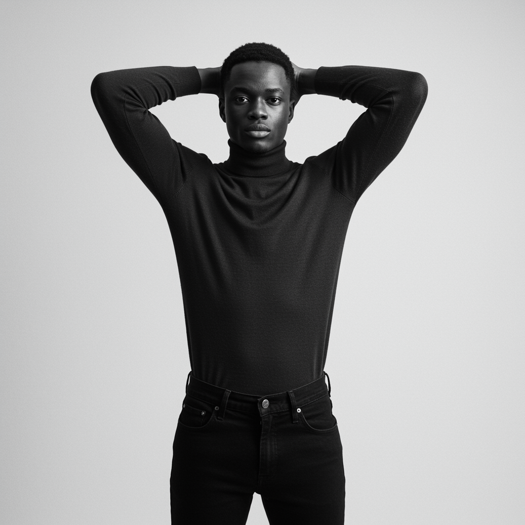 A full-body portrait of a male model exuding dynamic confidence, standing tall with an assured posture. His stance is enhanced by his arms raised, hands clasped behind his head, and elbows extended wide, projecting a blend of relaxation and strength. He wears a sleek, dark charcoal fitted turtleneck and tailored black jeans, emphasizing his athletic silhouette. His expression is calm yet intense, with a slight, contemplative furrow in his brow that deepens the intrigue of his gaze. The lighting is soft and angular, accentuating the structure of his face and the knit of his turtleneck. He is set against a minimalistic, airy backdrop that ensures all attention remains on him. Captured in a classic black and white aesthetic, the image exudes timeless sophistication, with a crisp focus on every detail of the model, effectively removing color to enhance the play of light and shadow.