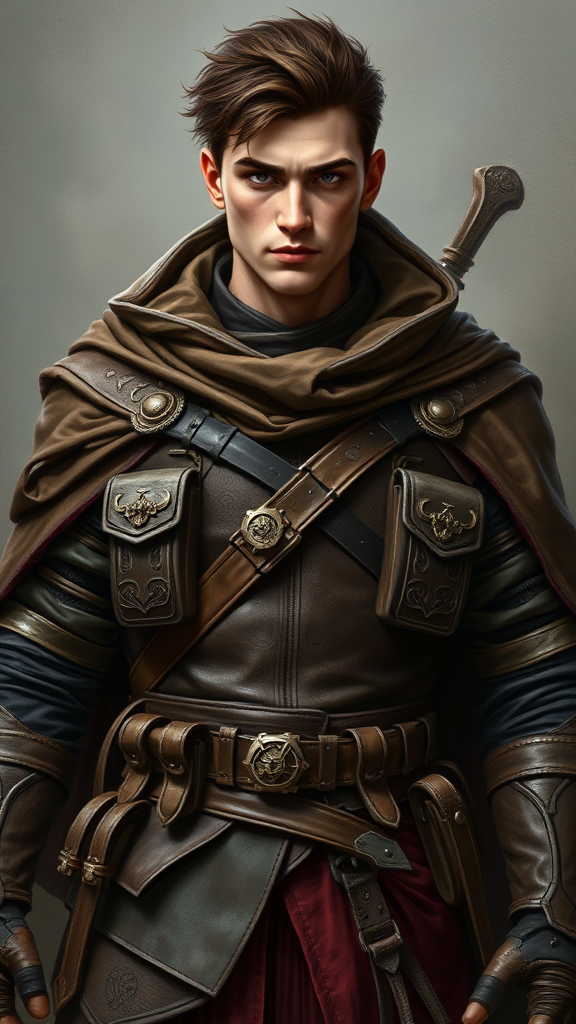 A full-body portrait of a male rogue in an award-winning, highly detailed masterpiece style, set in a fantasy RPG world. The image depicts a character with symmetrical features, embodying the essence of a Dungeons & Dragons adventurer. Clad in meticulously crafted leather armor, adorned with hidden pockets and intricate designs, the rogue stands poised and agile, exuding an air of mystery. His sharp gaze and confident stance suggest a life of stealth and cunning. Every detail, from the texture of his cloak to the subtle play of shadows, is rendered in 16k resolution, inviting viewers to explore the depths of his story.