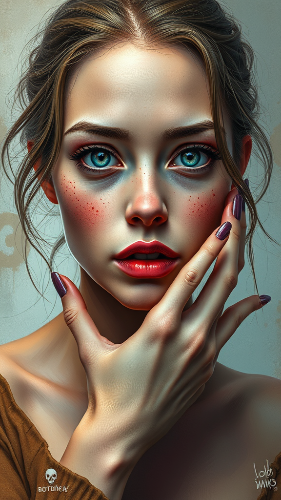 A full body portrait of a mesmerizing artwork, depicting a beautiful woman with an entrancing gaze, expertly crafted in a majestic oil painting style inspired by Ed Blinkey, Atey Ghailan, and Studio Ghibli. The piece showcases intricate details and sharp focus, influenced by the mastery of Jeremy Mann, Greg Manchess, and Antonio Moro, making it a trending sensation on ArtStation and CGSociety. The artwork is vibrant with unusual colors, framed on canvas, and exudes a photorealistic yet surreal charm, enhanced by elements of cartoon and 3D styles. The woman's freckles add depth, while the composition includes creative quirks like duplicated facial features, unexpected limb placements, and abstract proportions, resulting in a unique visual experience. The scene avoids traditional notions of beauty and perfect anatomy, embracing a more abstract and avant-garde interpretation, with hints of video game aesthetics and digital manipulation.