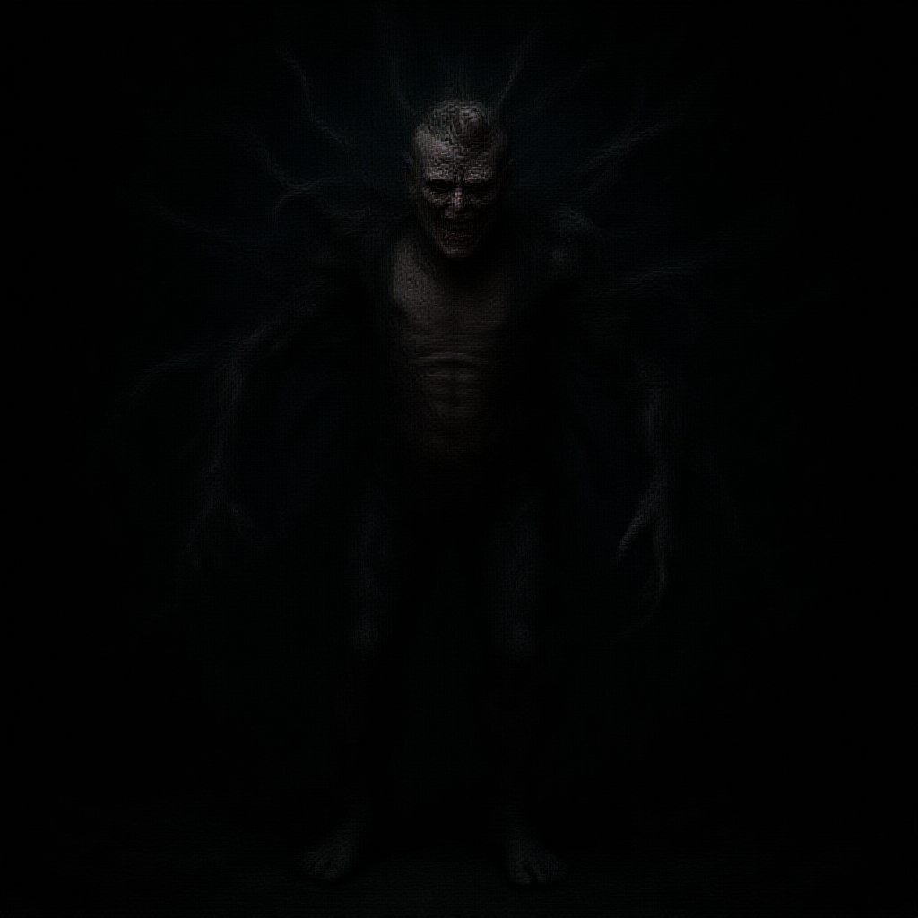 A full body portrait of a nightmarish figure exuding an unsettling aura. The figure appears in a surreal, distorted manner, heavily inspired by the haunting styles of Greg Rutkowski and Yoji Shinkawa. The composition is filled with dark and twisted lines, intricate particles swirling around a deformed man with grotesque features. The anatomy is deliberately skewed, with extra limbs emerging awkwardly, each arm and leg twisting unnaturally, giving an eerie sense of movement. The face is a chaos of poorly defined features, mismatched eyes, and an unnervingly elongated neck. The skin is an uncanny shade, accentuated with odd textures reminiscent of 3D renderings gone wrong, while the hands and feet are malformed. Hovering on the edge of reality, two heads merge into one, adding to the terror. Remnants of the man seem to fade out of frame, like a badly conjured apparition. A grotesque blend of art styles creating a trending nightmare on ArtStation.