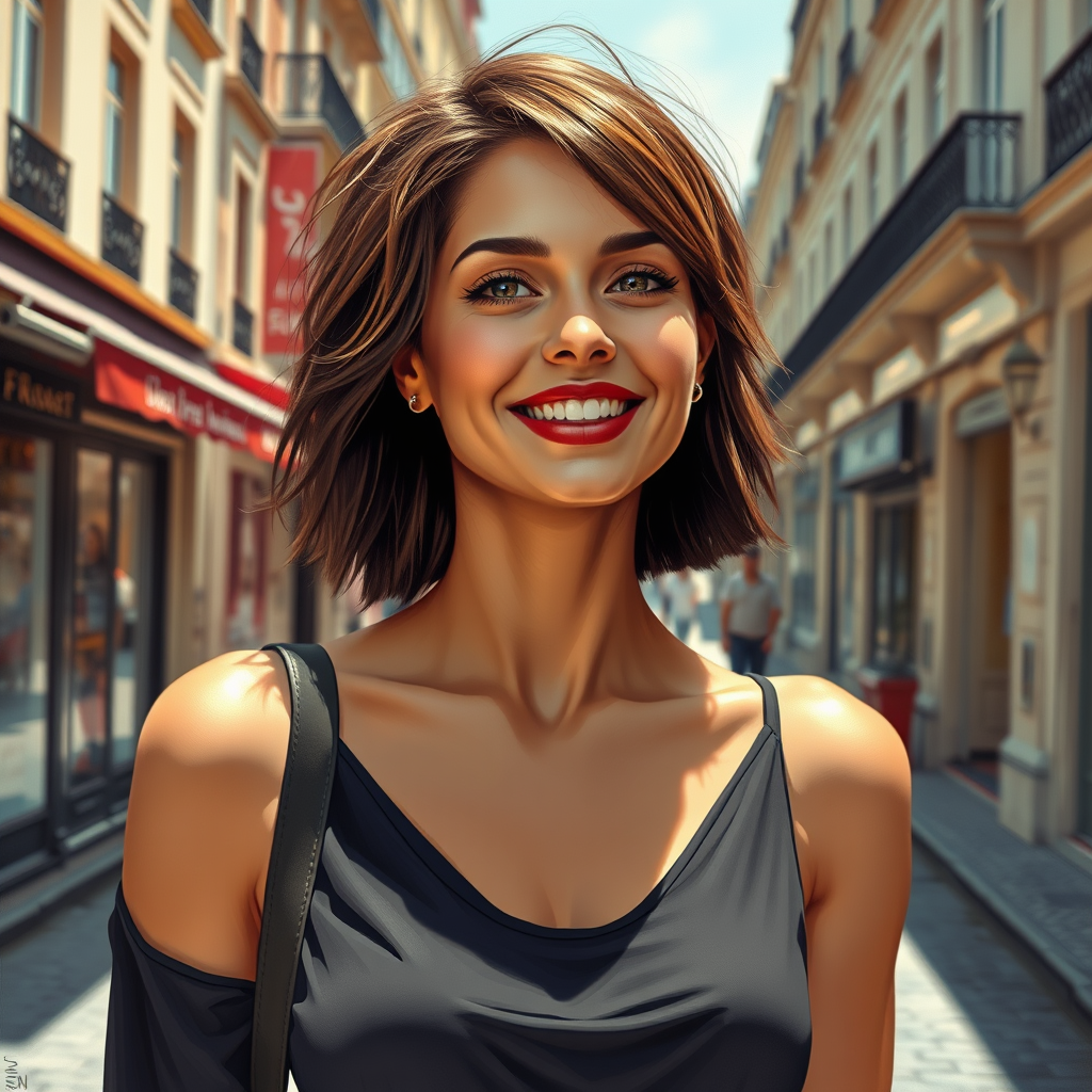 A full body portrait of a radiant young woman strolling down the bustling streets of Paris, exuding charm and allure, with an asymmetrical cut hairstyle that perfectly frames her captivating features. Her expression is lively and joyful, reflecting the vibrant energy of the city. The scene is depicted in exquisite detail, capturing the play of sunlight on the cobblestones and the intricate architecture of the Parisian buildings. The colors are rich and high in vibrance, showcasing the woman's mesmerizing presence amidst the lively backdrop. Inspired by the style of Frederick Arthur Verner, the painting evokes a sense of wonder and exploration, embodying both elegance and a touch of modern flair, with subtle artistic flourishes adding a hint of drama and sophistication.