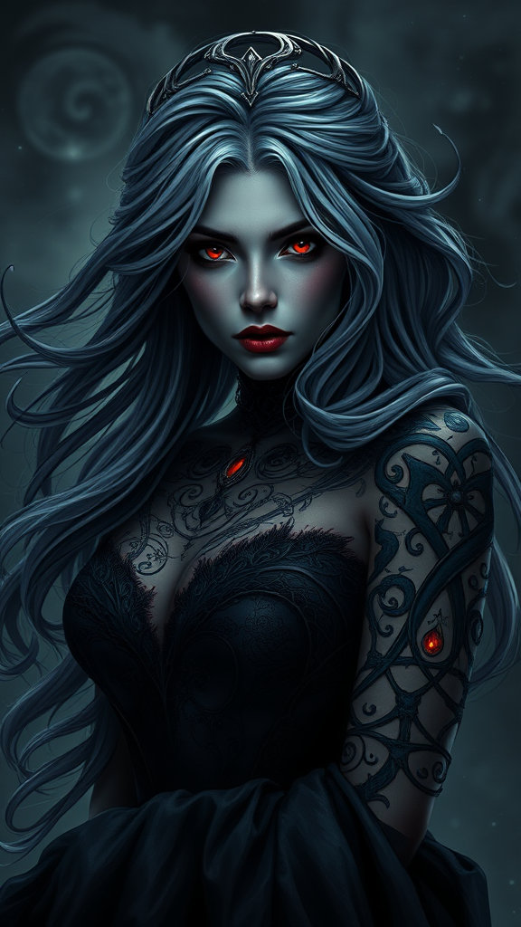 A full body portrait of a shadowy empress in a realm of shadow and mystery, exuding an air of dark fantasy with a suggestive and alluring theme. Her mystical presence is highlighted in a close-up view, emphasizing a dark, underworld aesthetic. Rendered as a deviant art masterpiece, her deep crimson eyes and flowing grey hair create a striking contrast. She wears an obsidian gown adorned with intricate, arcane tattoos that pulse with enigmatic energy. The color grading immerses viewers in a somber, atmospheric illustration enhanced by an 8k cinematic effect, capturing the essence of a dark queen ruling over her shadowy domain.