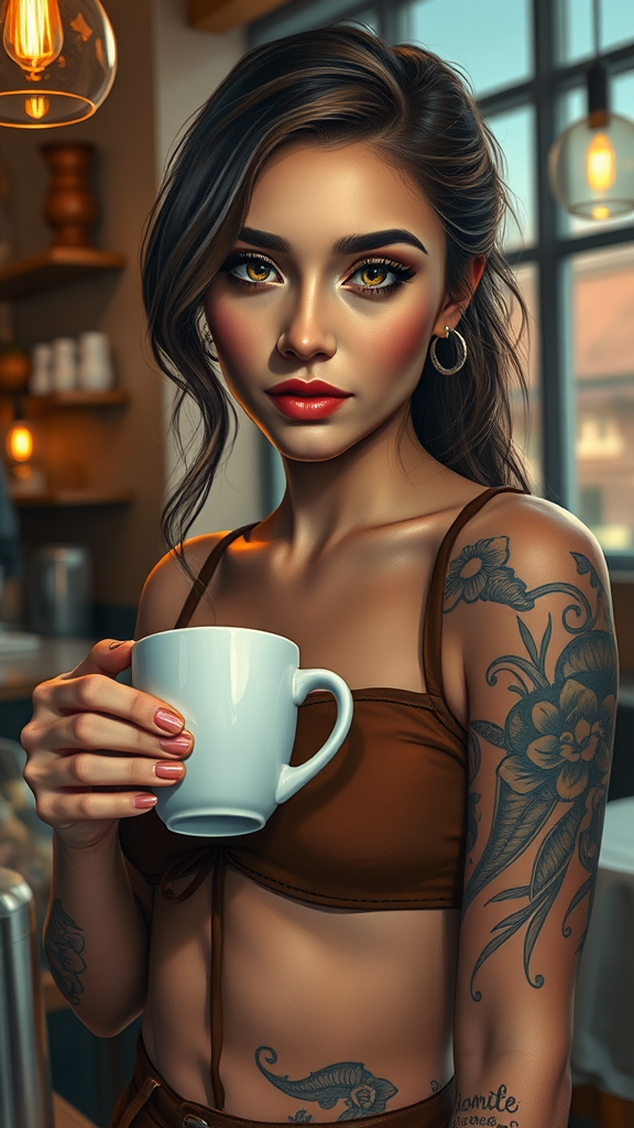 A full body portrait of a stunning barista girl gracefully serving coffee, with an eye-catching focus on her mesmerizing reflective eyes enhanced by mascara and makeup. Her face is detailed and symmetrical, featuring prominent cheekbones that exude charm. This scene captures a cozy atmosphere, highlighting her tattoos and the intricate lighting that employs a blend of dramatic rim lighting and chiaroscuro. She is depicted in a modern cafe interior, her midriff revealing toned stomach muscles, conveying both strength and elegance. The artwork is executed in a professional majestic impressionism style, reminiscent of the works of Waterhouse, John Constable, and Studio Ghibli, with influences from artists like Jeremy Mann and Greg Manchess. The painting is trending on ArtStation and CGSociety, known for its intricate and high detail. The design captures a blend of impressionism and the vibrant storytelling typical of Makoto Shinkai's Kyoto landscapes, all framed within a canvas.