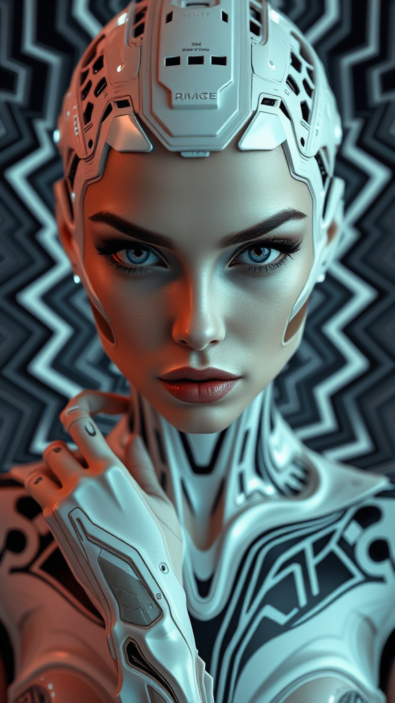 A full body portrait of a stunning model in a hyper-realistic fashion photoshoot, featuring intricate DMT-inspired abstract digital art. The model's eyes are wide open, with elements of white DMT creating bold, surreal patterns around her. The composition blends pop art influences with vray tracing technology to enhance zigzag motifs and dynamic textures. The model strikes elegant and emotive poses, exuding a sense of futuristic robotic expressionism. The overall aesthetic is both striking and immersive, capturing the essence of avant-garde fashion and digital art fusion.