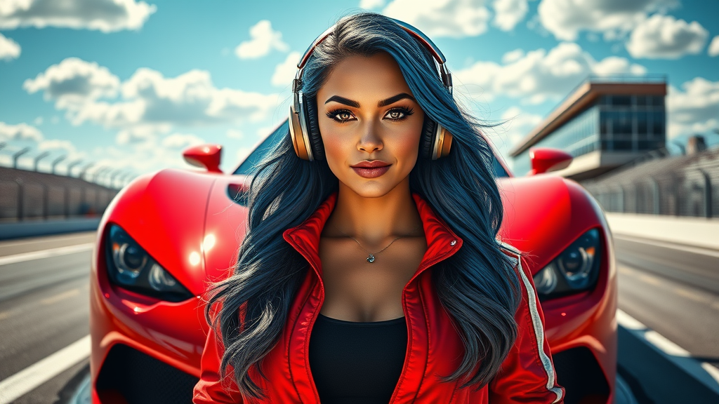 A full body portrait of a stunning racecar woman standing confidently in front of a gleaming red race car on a vibrant race track. She has a tanned complexion and long, flowing locks framing her symmetrical face, adorned with dark eyebrows, mascara, and makeup that enhances her striking features and a sly smirk. Her reflective eyes capture the essence of the moment as dust particles dance in the air under dramatic rim and chiaroscuro lighting. She wears an open racing jacket, and the scene is set against a backdrop of the race track, complete with a road, bleachers, and a blue sky dotted with white clouds. The artwork is inspired by the styles of John Constable, Ed Blinkey, Atey Ghailan, Jeremy Mann, Greg Manchess, and Antonio Moro. The piece is highly detailed, intricate, and trending on ArtStation and CGSociety, showcasing a modern blend of realism and vibrancy. The character features iconic blue hair styled in an 'Iron Mouse' fashion and wears headphones, adding a contemporary twist. The composition is polished with no imperfections, focusing on perfect proportions and an artistic balance that captivates the viewer's imagination.