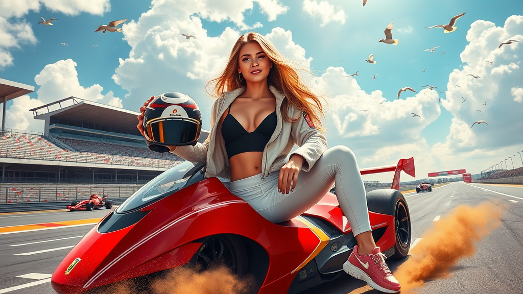 A full body portrait of a stunning woman, a beautiful racecar girl posing confidently on a sleek race car, holding a motorcycle helmet, with sun-kissed skin and flowing long hair. Her face is perfectly symmetrical, adorned with a warm smile, reflective eyes, and dark, expressive eyebrows accentuated by mascara and skillful makeup. Dust particles float in the air, accentuated by detailed, dramatic lighting that combines rim lighting and chiaroscuro effects. She wears a stylish black crop top beneath an open white racing jacket that showcases a hint of cleavage, paired with sleek white yoga pants and large, trendy pink sneakers. The scene is set on a bustling race track, featuring a vivid red racecar with prominent spoilers. In the background, a road, packed bleachers, a vast blue sky, and fluffy white clouds frame the scene, with birds soaring gracefully overhead. This majestic impressionist oil painting draws inspiration from masters like Waterhouse, John Constable, and Studio Ghibli, with influences from contemporary artists like Jeremy Mann and Greg Manchess. It trends on ArtStation and CGSociety for its intricate detail and dramatic aesthetic influenced by Makoto Shinkai's iconic Kyoto scenery. The artwork captures an energized atmosphere, infused with subtle creative touches, merging elegance with the thrill of the race track.