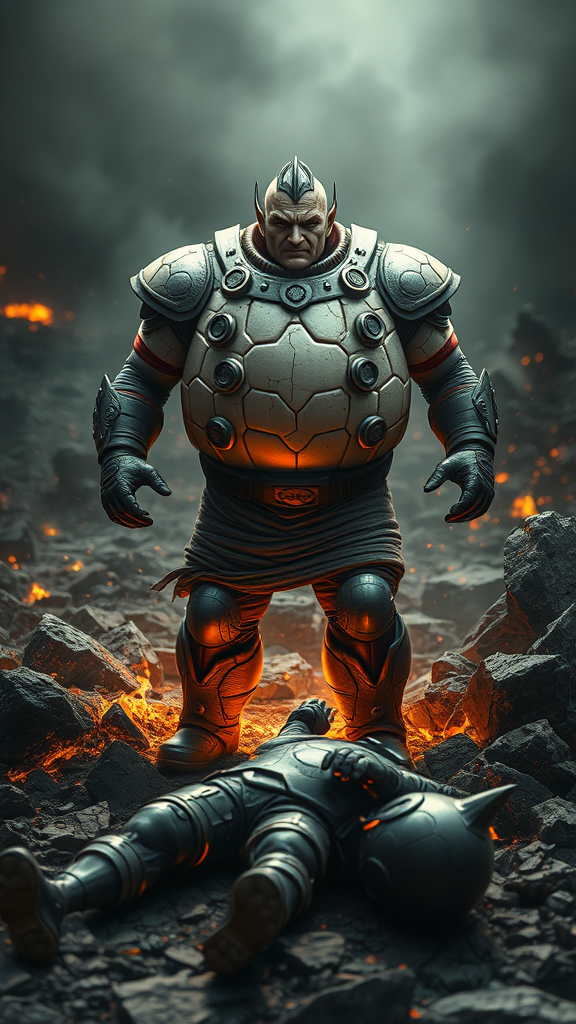 A full-body portrait of a superhero resembling a Humpty Dumpty character, with cracks on a shell-like armor, emerging valiantly from smoldering ashes on rugged terrain. The hero stands triumphantly, having defeated a villain lying defeated at their feet. They maintain a stern, resolute expression, piercingly looking at the viewer. Illuminated by soft light against a backdrop of embers, the scene is captured in sharp focus with intricate detailing. The muted colors enhance the emotional depth and realism of the setting. The digital painting captures extreme detail in 8k resolution, highlighting the profound resilience of the character.