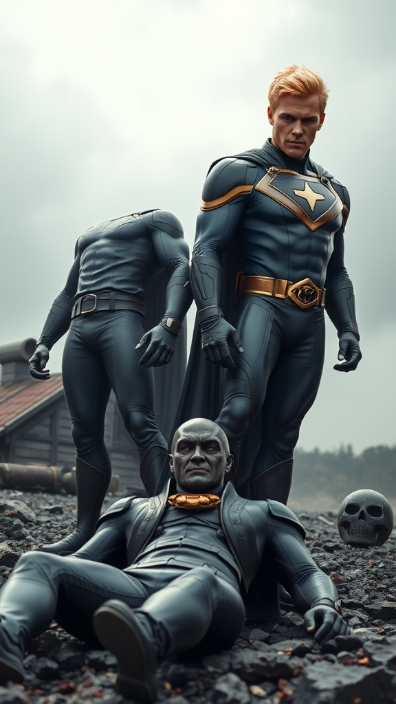 A full-body portrait of a very blond-haired, Richie Rich-like male character, reimagined as a superhero, accompanied by a character similar to Cadbury the butler, also in superhero form. They rise from the ashes, standing resiliently on rocky ground with a defeated villain at their feet. Both heroes exhibit stern expressions, directly engaging the viewer with a burning intensity in their eyes. The scene is rendered in sharp focus with intricate details, utilizing muted colors to convey a sense of somber triumph. The composition is captured in a realistic, photography-like style with emotionally profound undertones. Soft lighting enhances the highly detailed textures of their costumes and surroundings, all depicted in extreme 8k digital painting resolution.