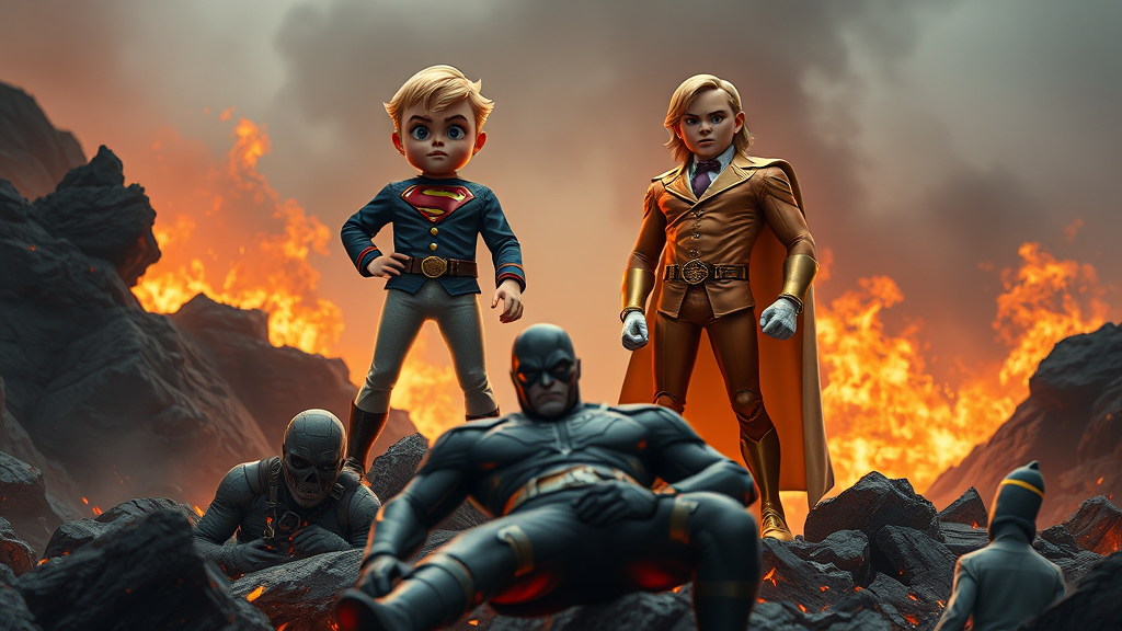 A full-body portrait of a very blond-haired Richie Rich character, transformed into a superhero, standing alongside a superhero Cadbury butler. Both rise from the ashes, standing on jagged rocky ground with a defeated villain at their feet. Their expressions are stern and determined, eyes fixed on the viewer. The scene is burning but captured in sharp focus, showcasing intricate details with muted colors that add depth and realism. It's a photographic quality digital painting, emotionally profound and richly detailed, with soft lighting that enhances the heroic ambiance. Rendered in 8k resolution, every element is meticulously detailed, creating an epic and inspiring composition.