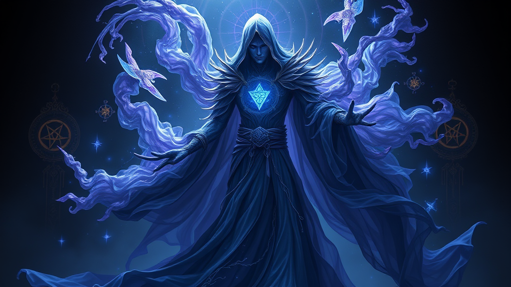 A full body portrait of a void arcanist, intricately detailed with ethereal robes swirling like nebulae, the figure bathed in dramatic, volumetric lighting casting mystical shadows, embodying the essence of fantasy art with surreal, dreamlike elements, rendered with the depth and clarity akin to an Octane render, surrounded by cosmic energies and arcane symbols subtly glowing in the dimly lit environment.