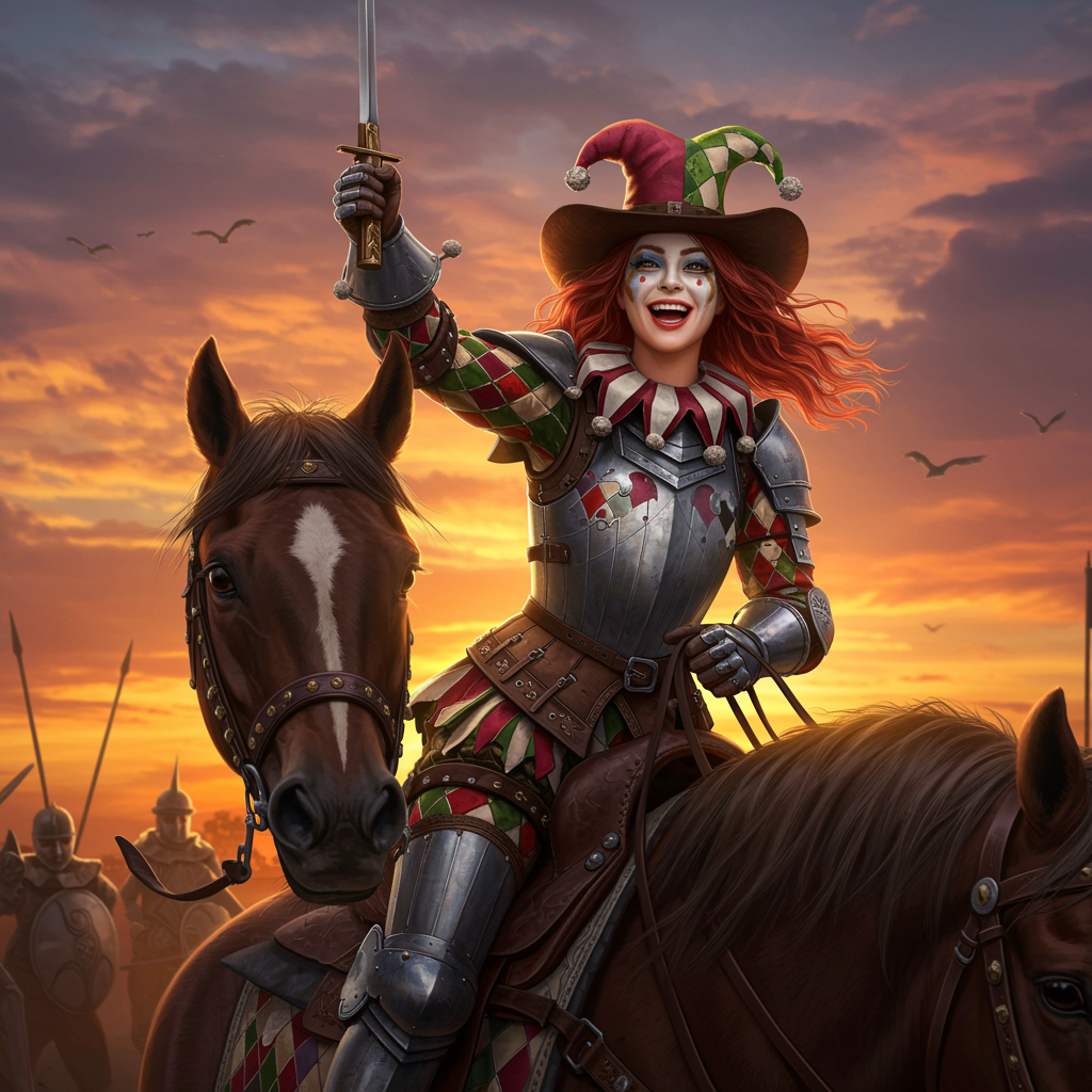 A full-body portrait of a woman embodying a unique fusion of cowgirl and knight, joyfully smiling as she rides a horse under the vibrant hues of a sunset. Her attire reflects a whimsical Venetian carnival flair, with intricate designs and vibrant colors. The setting suggests an intense yet playful battle scene, capturing the spirit of adventure and courage. Rendered in high resolution with hyper-realistic detail, the composition is reminiscent of an oil painting, inspired by the dynamic and imaginative style of Frank Frazetta.