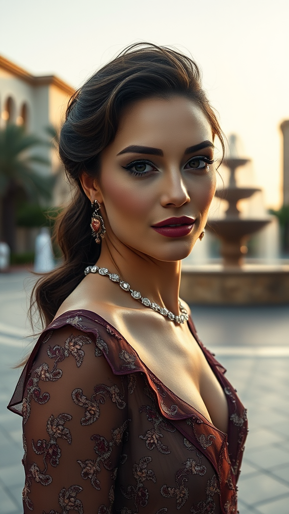 A full-body portrait of a woman looking at the camera, dressed in haute couture, situated in a town square with a fountain in the distant background in Dubai. The image is captured with a Cinestill Hasselblad 50mm camera, showcasing photorealistic and hyper-detailed qualities. The composition highlights glamour and the golden ratio with soft lighting. The woman's skin is depicted with intricate details and a matte finish, enhanced by subtle subsurface scattering. The scene embodies a studio photography feel with high-quality film grain, resulting in an ultra-realistic portrayal with analog style. The focus is on capturing the essence of elegance and sophistication, avoiding any imperfections or distortions in the presentation.