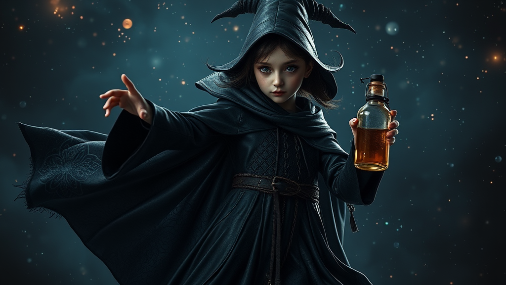 A full-body portrait of a young and slightly eerie girl wizard in motion, captured mid-dance in a slow-motion pose. Her dark, intricately patterned leather cloak flows around her, and her small hand delicately conjures a toxic spell from a mysterious bottle. The backdrop is a moody, cosmic universe filled with dark, immersive colors. The scene is crafted in exceptionally high detail, with blooming highlights, creating an 8k, photorealistic digital art masterpiece. The focus is on her perfectly proportioned body, the intricate shadows playing across her form, and her strikingly detailed face and eyes with sharply defined pupils. The overall atmosphere is one of elegance with a hint of the supernatural, styled in the vein of 3D concept art reminiscent of Chao Teng Zhao's brilliant work.
