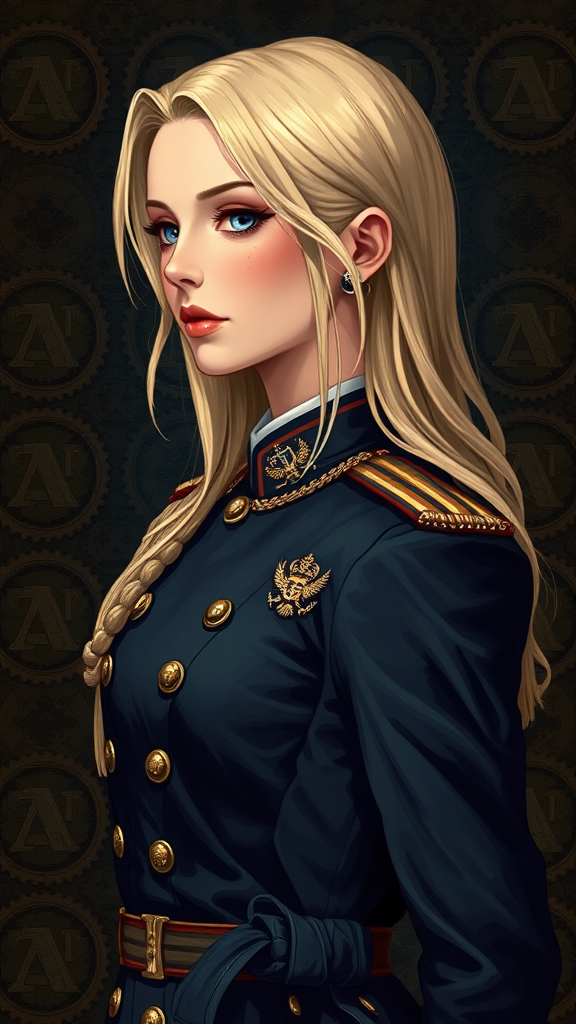 A full-body portrait of a young woman in an officer's ceremonial tunic, her loose blonde hair cascading down her shoulders. She exudes the refined elegance of dieselpunk aristocracy with a model-like face, adorned with intricate monograms. The style is reminiscent of anime with maximum detailing and realism, set against a backdrop of intricate cogs and subtle monograms. The painting captures a blend of Russian and British empire aesthetics in the distinctive Ian McQue style. The color palette is dominated by dark hues, embodying a vintage, retro-futuristic vibe. The illustration is rich in detail, showcasing an 8k resolution with a side view perspective, enhancing the character's intricate, aristocratic allure.