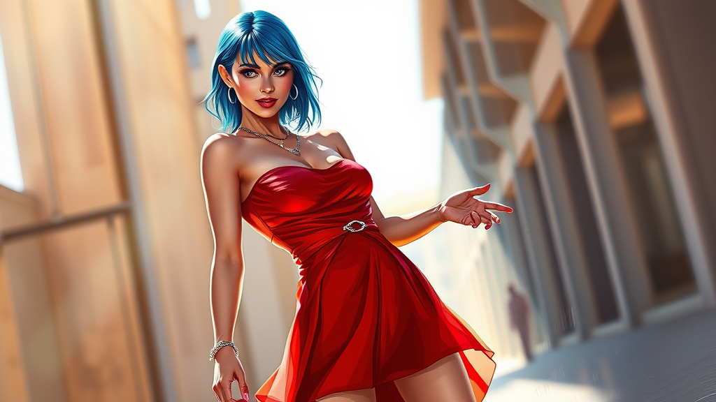 A full-body portrait of a young woman with a sly smile, donning a short red dress and extremely high heels, reminiscent of the Matrix style. Her vibrant blue hair contrasts beautifully with stunning jewelry. The artwork is intricate, using loose strokes and a bright, luminous color palette that captures light and movement in an impressionistic manner. She stands bathed in soft natural light, highlighted by sunshine that caresses her form, offering a cinematic glow. The setting features lumen reflections, creating a stunning environment with hyperrealism enhanced by CGI and octane render. Raytracing techniques emphasize the dynamic interplay of light and shadow, bringing the scene to life.