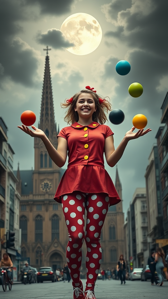 A full-body portrait of a young woman with a warm smile and cheerful disposition, capturing the essence of a playful, generous spirit. She stands in a bustling cityscape, wearing vibrant polka-dot leggings as part of her whimsical clown-inspired attire. In her hands, a series of colorful balls are in mid-air, showcasing her juggling skills. The backdrop features a grand cathedral, adding a touch of historical elegance to the lively scene. Overhead, an ominous sky looms, with a glowing full moon partially hidden by clouds, while volumetric lighting bathes the scene in a dramatic yet serene aura. The setting has a hyper-realistic quality, reminiscent of an oil painting by a master like Frank Frazetta, capturing a moment of joy and wonder amidst an urban landscape.