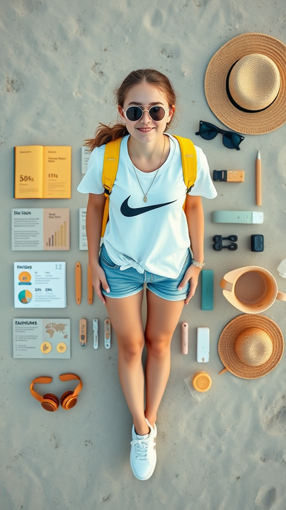 A full-body portrait of an American girl at the beach, embodying a fashion-forward yet casual style. She is seen wearing a white T-shirt featuring the iconic Nike logo, paired with sleek white sneakers that complement her laid-back look. Her ensemble is enhanced by the addition of stylish sunglasses and a vibrant yellow backpack slung over her shoulder, adding a pop of color to her outfit. The scene is captured in high definition, with the main color theme being #ff7ad2, softly infusing the image with a playful and youthful aura. Shot from above, the image offers a unique perspective that emphasizes her overall look in stunning 8k photorealism. Surrounding her are various beach-related items arranged in a meticulous knolling layout, augmented with text descriptions and data visualizations, creating an engaging visual story that seamlessly combines fashion with an analytical aesthetic.