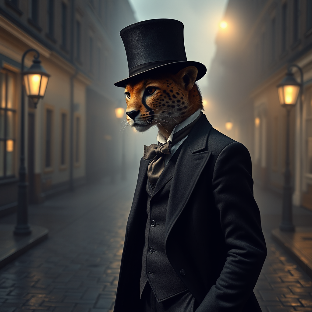 A full body portrait of an anthropomorphic cheetah elegantly dressed as an English gentleman, complete with a tailored suit and top hat, strolling through the foggy streets of Victorian London at dusk. The scene is enveloped in a soft volumetric fog and atmospheric glow, creating a mysterious and intriguing ambiance. The cobblestone streets are glistening with a subtle sheen from recent rain, and the warm glow from gas lamps casts long shadows. The cheetah's expression is thoughtful, with a slight smirk as if he's lost in deep contemplation. There are no visible errors or distortions, and the image maintains a high level of artistic integrity with realistic anatomy and proportions, capturing the unique blend of human-like sophistication and the graceful physique of a cheetah.