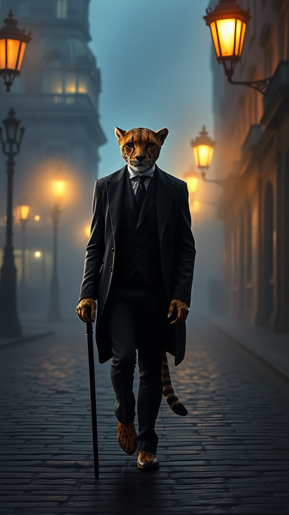 A full body portrait of an anthropomorphic cheetah dressed as an elegant English gentleman strolling through the misty streets of Victorian London at dusk. The scene is enveloped in a soft, volumetric fog that adds a mysterious atmosphere to the cobblestone paths and gaslit lamps. The cheetah wears a tailored suit with a waistcoat, a top hat, and carries a walking cane. The background hints at ornate Victorian architecture partially visible through the hazy air, creating a sense of historical depth. The silhouette of the cheetah is accentuated by the dim, ambient glow of streetlights, casting elongated shadows on the ground.