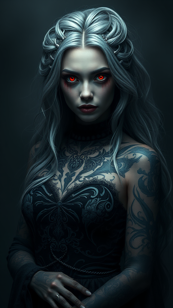 A full body portrait of an enigmatic dark queen emanating a shadowy, mystical aura, capturing a fantastical underworld theme. Her piercing crimson eyes glow with an eerie intensity, contrasting strikingly against her cascading grey hair. She is adorned in an intricately detailed dark dress that flows like whispers of night, with elaborate dark tattoos tracing ethereal patterns across her skin. The scene is a deviant art masterpiece, showcasing a rich color grading that enhances the dark and mystical atmosphere. The artwork embodies a cinematic 8k effect, immersing the viewer in a world of alluring darkness.