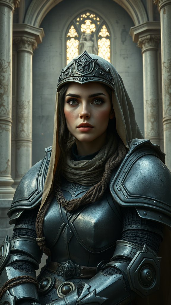 A full-body portrait of an exceptionally beautiful woman, resembling an iconic sister of battle, seated in a desolate cathedral. Her detailed, symmetrical face features reflective eyes, dark eyebrows, and expertly applied makeup. Her armor is worn and cracked, conveying battle-hardened resilience, all depicted in the distinctive style of Warhammer 40k. The setting is a ruined marble cathedral, adorned with dust particles, bullet holes, and cracked walls. Dramatic and rim lighting enhance the scene's intensity. The artwork has the professional touch of impressionism, reminiscent of masters like Waterhouse, Constable, and modern talents like Atey Ghailan, positioned as if in a majestic oil painting. It trends on platforms like ArtStation and CGSociety for its intricate detail and dynamic composition. The subject wears a veil, hat, and steel armor, adding to her regal aura. Despite being derived from an elaborate narrative, the creative scene excludes any surreal or distorted elements, ensuring it maintains its stunning and refined artistic integrity.