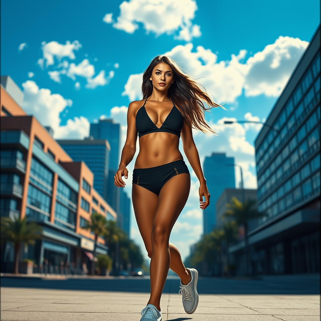 A full body portrait of an exceptionally beautiful fitness girl walking confidently downtown. She has long flowing hair and a perfectly detailed symmetrical face. Her eyes are reflective and her cheekbones are prominent. The scene is illuminated with dramatic chiaroscuro and rim lighting, capturing every detail. She wears stylish white sneakers. The background features a vibrant blue sky with scattered white clouds, enhancing her toned physique. Inspired by the styles of John Constable, Ed Blinkey, Atey Ghailan, Jeremy Mann, Greg Manchess, and Antonio Moro, this artwork is intricate and trending on ArtStation and CGSociety. The composition includes elements of nature like lakes, oceans, and rivers, merging historical and contemporary influences. The piece is captured within a canvas frame, showcasing a well-balanced artistic mastery without abstract color schemes or distortions.