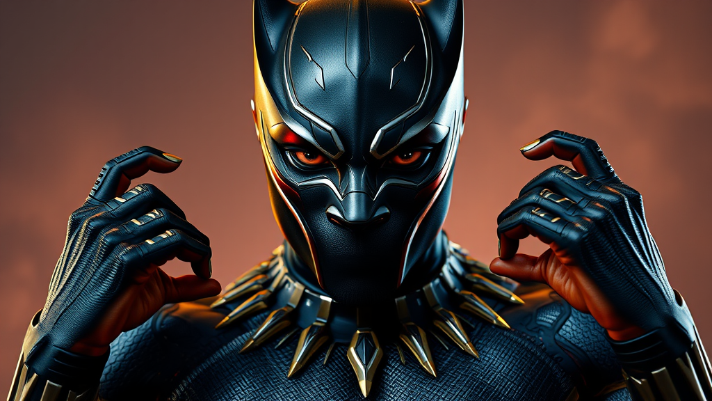 A full body portrait of Chadwick Boseman as Black Panther, captured in a powerful pose, with vibrant colors and cinematic lighting. The image features intricate and detailed artistry, reminiscent of trending pieces on Artstation. It combines elements of hyperrealism with an 8K resolution and the finesse of Unreal Engine 5, yielding a masterpiece quality. However, the image is intriguingly imperfect, featuring subtle distortions like misaligned anatomy or additional limbs like extra fingers or toes, creating an artistic tension. The portrayal includes slightly blurred edges and faint watermarks, lending a draft-like quality that suggests creativity and experimentation. The powerful essence of Black Panther is retained amid these artistic choices, capturing a unique blend of precision and artistic abstraction.