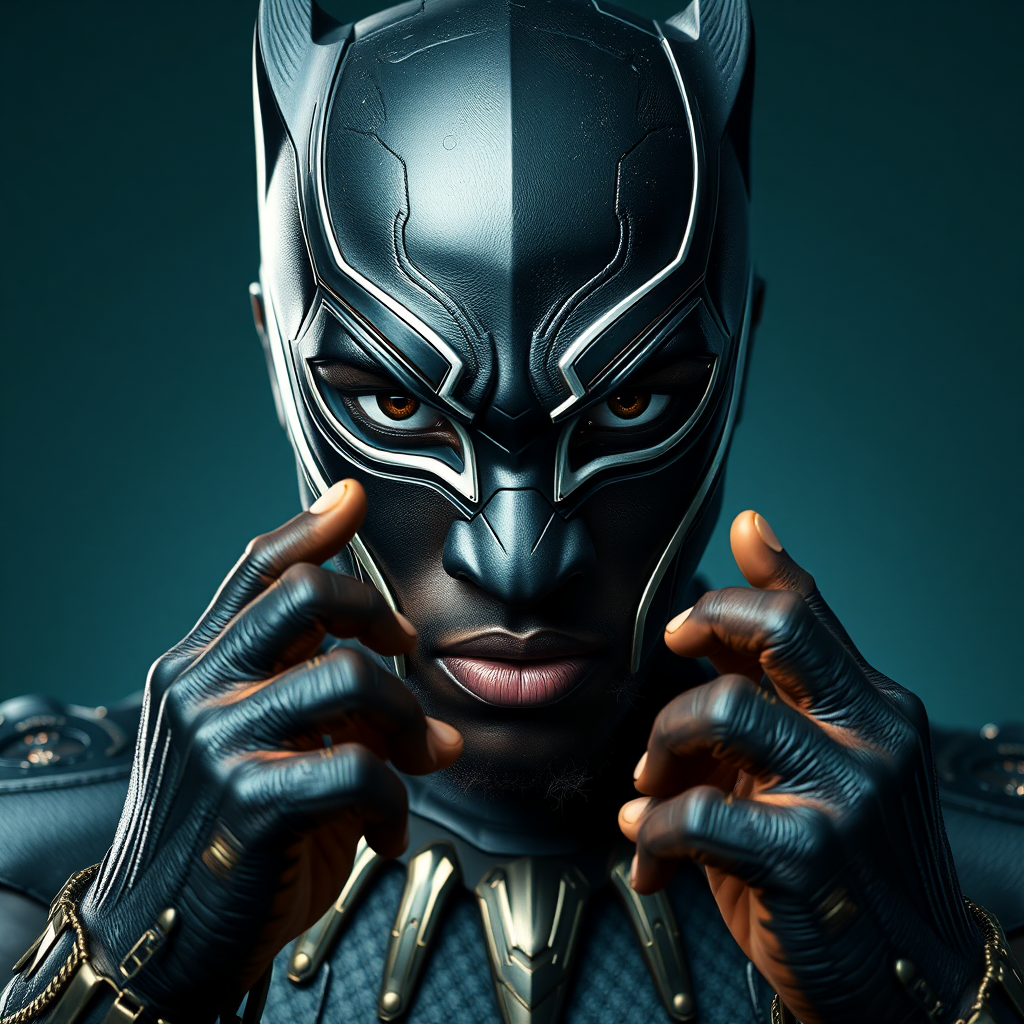 A full-body portrait of Chadwick Boseman as Black Panther in a dynamic glare pose, showcasing intricate details and vibrant colors under cinematic lighting. The image is highly detailed, with an 8k hyperrealistic quality that makes it appear as if rendered in Unreal Engine 5. While focusing on extreme details, the artwork maintains its cinematic quality and appears as a true masterpiece, albeit with intentional imperfections like poorly drawn hands, feet, and face, creating a surreal effect. Some elements are out of frame, and the piece features artistic anomalies such as extra limbs and disfigured anatomy that lend a sense of dreamlike distortion. The composition includes grainy textures and intentional visual distortions such as blurred segments, cut off body parts, and unusual positioning, contributing to an abstract and mysterious aesthetic. The image carries a unique charm despite—or perhaps because of—its unclear and undefined features, making it an intriguing visual exploration.