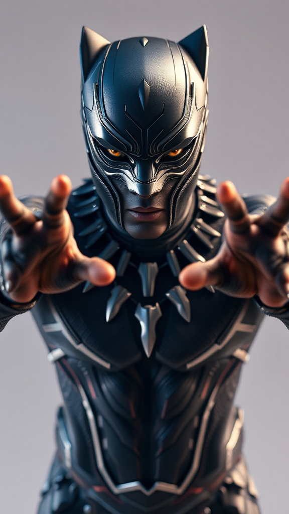 A full body portrait of Chadwick Boseman as Black Panther capturing a powerful glare pose, showcasing intricate details and vibrant colors under cinematic lighting. The image is hyperrealistic and utilizes the capabilities of Unreal Engine 5 to achieve extreme detail and a cinematic presentation. Despite its artistic aspirations, the composition suffers from elements like tiling, poorly rendered anatomy such as the hands, feet, and face, and includes disfigured or deformed aspects. Parts of the body are cut off or out of frame, resulting in a blurred and grainy appearance with jpeg artifacts. Additional visual clutter includes watermarks, text logos, and signatures. The anatomy features issues like extra limbs, fingers, and toes, with limbs placed in unrealistic, impossible positions. Facial features are mismatched, with crossed eyes, crooked lips, and an overall unclear and undefined expression. The image feels off-center, with poor composition and unwanted duplications, resulting in a plastic and artificial feel, further marred by elements of mutation and deformity.