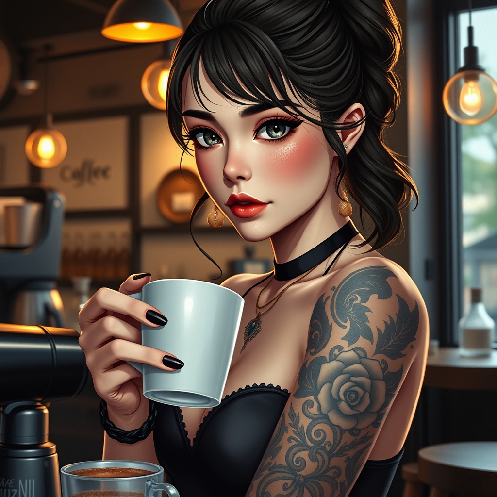 A full body portrait of the most enchanting barista girl in the world, with a focus on her expressive eyes, as she serves coffee. Her face is symmetrical and beautifully detailed, featuring mascara and makeup that highlight her prominent cheekbones. The setting is cozy, with intricate lighting including rim lighting and chiaroscuro that adds a dramatic effect. Decorated with tattoos, her midriff is visible, showcasing toned stomach muscles. The cafe has a modern interior design. The style is an impressive blend of impressionism with a touch of whimsy, inspired by artists like Waterhouse, John Constable, and Studio Ghibli, and reminiscent of works by Jeremy Mann and Greg Manchess. The art piece is trending on platforms like ArtStation and CGSociety. It is intricate and high in detail, with an anime-inspired flair akin to Makoto Shinkai’s Kyoto scenes, all encapsulated within a canvas frame. The piece balances realistic elements with artistic creativity, ensuring no distorted or exaggerated features, capturing the essence of beauty in a harmonious scene.