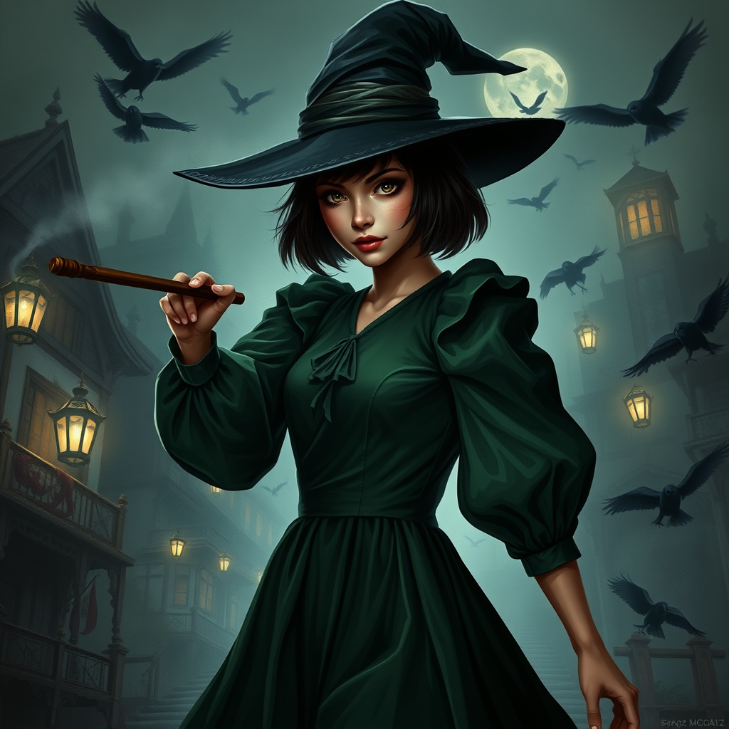 A full body portrait of the most powerful witch in the world, aiming her wand with intent, as a beautiful witch woman casting a spell. She's walking confidently towards the viewer, showcasing short hair that accentuates her alluring features. Her makeup, including mascara and reflective eyes, adds depth to her enchanting gaze. The atmosphere is thick with fog, highlighting her cute nose and the rim and dramatic chiaroscuro lighting that creates an air of mystery. She wears a green dress with puffy sleeves, set against the backdrop of a gothic Victorian town with crows adding an ominous vibe. The style is a professional majestic impressionism oil painting inspired by Waterhouse, John Constable, Ed Blinkey, Atey Ghailan, Jeremy Mann, Greg Manchess, and Antonio Moro. It's trending on ArtStation and CGSociety for its intricate high detail and dramatic effect. The scene captures a blend of Makoto Shinkai Kyoto aesthetics with a touch of cartoonish charm, all within a refined canvas frame. The overall image maintains clarity and beauty, avoiding any distortions or anomalies, celebrating perfect proportions and exquisite artistry.