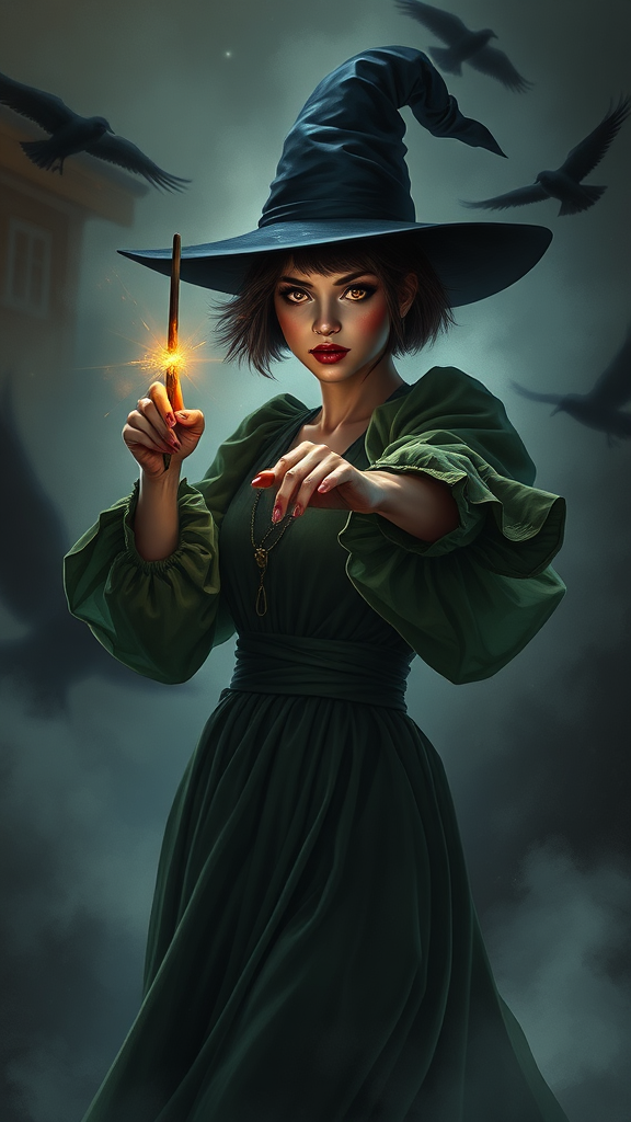 A full body portrait of the most powerful witch in the world, aiming her wand with precision, a beautiful witch woman casting a spell as she walks towards the camera. She has short hair, striking reflective eyes accentuated by mascara, and makeup that enhances her features like a cute nose. The scene is enveloped in fog, with dramatic chiaroscuro lighting creating a rim-lit effect on her puffy sleeves. Set in a gothic Victorian town, crows circle in the background. This image is a professional, majestic impressionism oil painting inspired by the styles of Waterhouse, John Constable, and Jeremy Mann, blending high detail with the dramatic flair of Greg Manchess and Antonio Moro. The painting captures the essence of makoto shinkai kyoto, trending on ArtStation and CGSociety. She wears a flowing green dress that complements the intricate, high-detail rendering. The canvas frame adds a touch of classic elegance, while the composition embraces the richness of colors and light, void of any imperfections, creating a captivating and enchanting visual narrative.