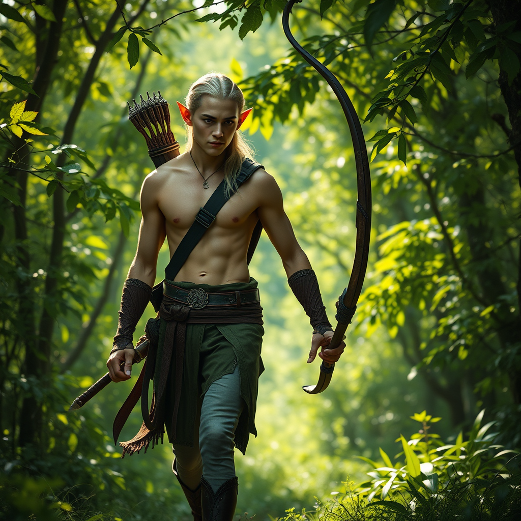 A full-body portrayal of a male elf walking gracefully through a dense, vibrant forest, inspired by Tanis from Dragonlance. This elven archer, poised and alert, exudes an athletic build with finely detailed facial features and striking eyes that convey wisdom and curiosity. Masterfully crafted, capturing the essence of nature as gentle sunlight filters through the lush canopy, creating a play of light and shadow across the scene. The image is produced in 8k resolution, verging on photorealism, and reflects the artistic techniques of Jeremy Mann, Sandra Chevrier, and Maciej Kuciara. The scene is sharp and realistic, with authentic shadows and three-dimensional depth, subtly enhanced to elevate this cinematic piece.
