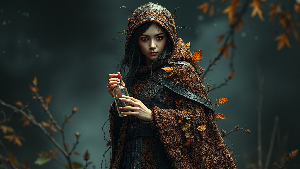 A full-body portrayal of a slightly eerie girl wizard, intricately formed from autumnal foliage and plants. Her movement is captured in a slow, dance-like pose, exuding an anatomical grace. She dons a cloak crafted from brown moss interwoven with dark leather, creating intricate patterns. Holding a vial of toxic spellcraft, she stands against a dark and moody universe background, rich with autumnal plant matter. The scene is defined by unprecedented detail, bloom effects, and the highest quality digital design, offering a photorealistic and sharp depiction. Her face and eyes are meticulously detailed, featuring sharp, detailed pupils. The image achieves a lifelike perfection with complex shadows, adding a three-dimensional realism, embodying the artistic style reminiscent of Chao Teng Zhao's work.