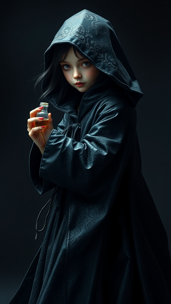 A full-body portrayal of an enigmatic, slightly eerie young girl with a wizard aura, wrapped in a dark, intricately patterned leather cloak. She stands in motion, captured beautifully in a dance-like pose, her movements frozen in a slow-motion elegance. A tiny, mysterious vial sits in her delicate hand, hinting at a conjured toxic spell. The setting is a dark and moody universe, intricately detailed and filled with an ethereal atmosphere. The artwork is presented in a stunningly high-quality, digital concept art style, boasting 8k resolution and sharp precision. Her face and eyes are meticulously detailed, with piercing pupils that capture attention. The image showcases a perfect, realistic form with an emphasis on intricate shadow work, all created in an impressive 3D style. The piece is inspired by the artistic vision of Chao Teng Zhao, achieving a masterpiece level of detail and photorealism.
