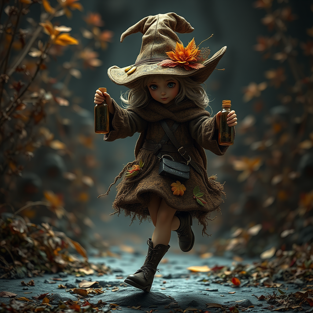 A full-body pose of a little girl wizard, made from a blend of autumnal foliage and plants, gracefully dancing in slow motion. Her cloak is composed of brown moss and dark leather, intricately woven into complex patterns, and she holds a bottle of toxic spellcraft. The setting is a dark, moody universe where the background is alive with autumnal-hued plant matter. The scene is rendered with extreme attention to detail, featuring bloom effects, photorealistic elements, and razor-sharp clarity. Her detailed eyes and face reflect a masterpiece of digital art, showcasing a perfect body with lifelike, intricate shadows. The design adopts a 3D style influenced by Chao Teng Zhao, merging the magical and the realistic in a captivating concept art piece.