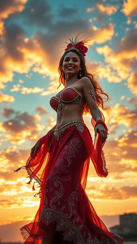 A full-body scene of a joyful, smiling woman at sunset, adorned in intricate Venetian carnival attire, blending the grace of a belly dancer and the strength of a warrior. Volumetric lighting casts an ethereal glow, highlighting her enchanting presence and vibrant details. The sky, a masterpiece of clouds reminiscent of Albert Bierstadt's work, frames her figure with rich colors. The scene captures hyper-realistic features with ultra details, as if painted by Frank Frazetta, merging the elegance of an oil painting with the intensity of her spirited character, set in a breathtaking high-resolution panorama.