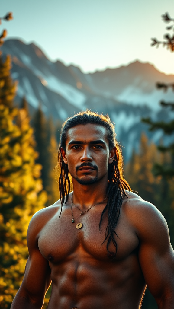 A full body shot captures a robust young Native American man standing amidst the majestic mountains of Colorado. His chiseled facial features are beautifully illuminated by the soft, golden glow of the sun's evening rays, filtering gently through the forest canopy. Shot with a Canon EOS R and a 50mm lens set at f/2.8, with ISO 100 and a 1/100 sec shutter speed, the photograph utilizes the ethereal golden hour light to envelop the scene in warmth and serenity. The composition is artfully arranged, positioning the young man centrally in the frame, encircled by the verdant greenery of the forest. The gentle soft focus imparts a dreamy vibe, underscoring the serene and tranquil essence of the moment. The finished portrait is a breathtaking depiction of a young man harmonized with his natural surroundings, presented in UHD dtm HDR 8k.