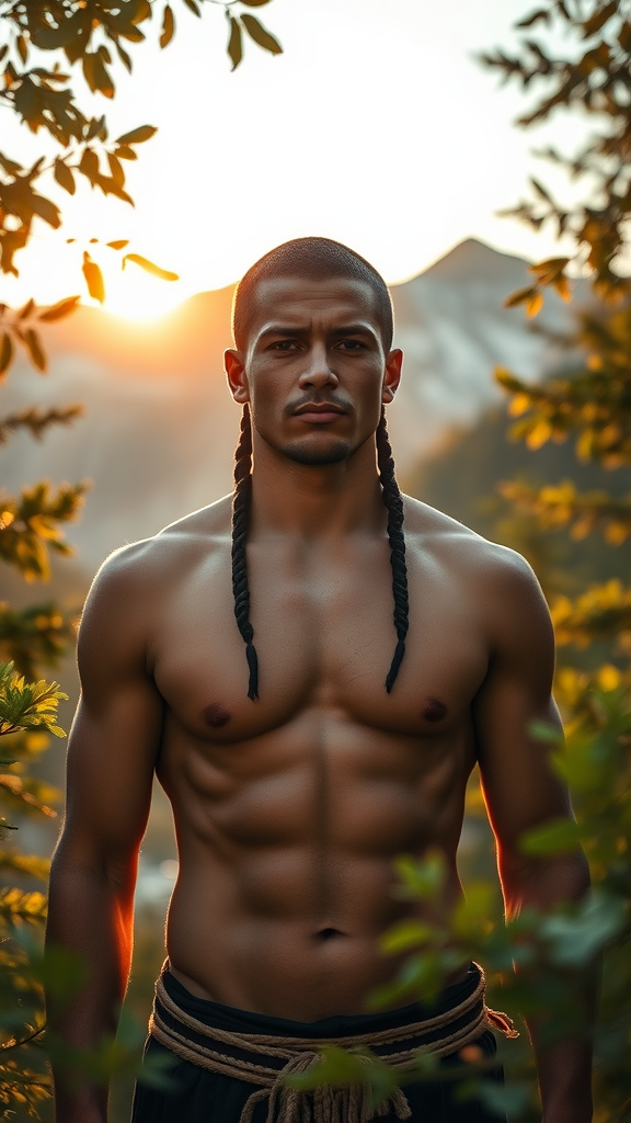 A full-body shot captures a young Native American man standing amidst the majestic mountains of Colorado. His muscular physique is bathed in the gentle glow of the evening sun, with the light filtering softly through the forest leaves, highlighting his striking facial features. This photograph was taken with a Canon EOS R camera, using a 50mm lens with settings at f/2.8, ISO 100, and a shutter speed of 1/100 sec. The natural golden hour lighting enhances the warmth and serenity of the scene, with the young man centered in the frame, enveloped by the forest's lush greenery. A soft focus adds a dreamy, ethereal quality, underlining the peaceful and tranquil essence of the moment. The image is a beautifully crafted UHD dtm HDR 8k portrait, capturing the young man's presence within his natural environment with subtle artistic adjustments.