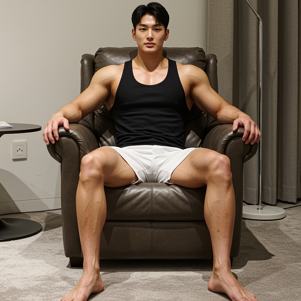 A full-body shot depicts a tall, muscular Korean man with a youthful appearance, dressed in a sleek black stringer tank top and stylish white shorts, relaxing comfortably in a plush modern recliner. His bare feet rest naturally on the ground, showcasing muscular and intricately defined legs. The setting exudes contemporary elegance, and the room bathes in soft, ambient light that highlights the contours of his physique. The overall composition captures the essence of strength and relaxed confidence, infused with subtle touches inspired by the iconic style of Touko Valio Laaksonen.