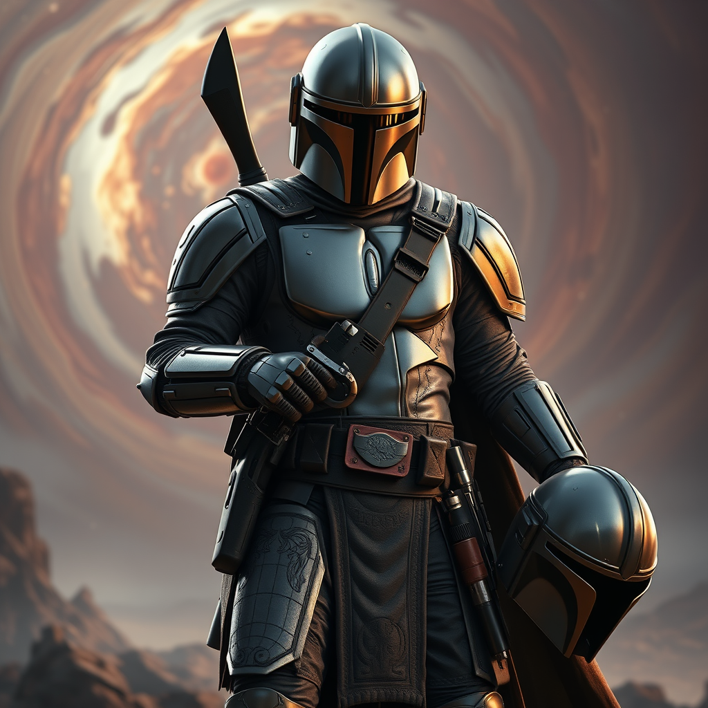 A full body shot of a Mandalorian warrior, character concept art showcasing the artistry of Roberto Ferri, capturing an epic stance with intricate details, featuring gleaming armor with ornate etchings. Set in a vivid 4k, UHD resolution, the scene is enriched with dramatic lighting that highlights the textures and shadows, adding depth to the character's imposing presence. The background features a swirling, nebula-like atmosphere, infusing a sense of otherworldly mystique. A mysterious emblem subtly adorns the chest plate, suggesting an unknown allegiance and a storied past. The pose is both dynamic and poised, one hand resting confidently on a holstered blaster, the other clutching a uniquely designed helmet under the arm. The environment hints at a distant planet's rugged terrain, adding context and narrative to the image.
