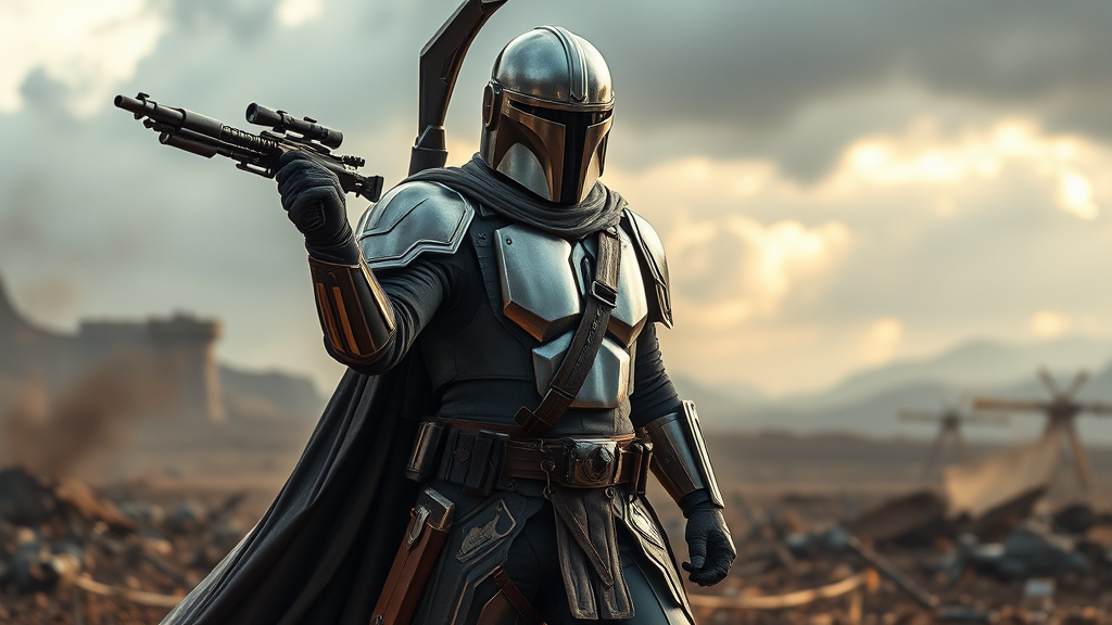 A full body shot of a Mandalorian warrior in an elaborate and intricately designed armor, showcasing character concept art inspired by Roberto Ferri, capturing an epic stance with intricate metal details glistening under dramatic lighting, set against a war-torn landscape, in stunning 4k UHD quality, the figure’s resolute expression and poised blaster highlighting a sense of determination and mystery, cloak billowing in the wind, with subtle creative modifications to helmet design and armor embellishments to enhance the overall visual impact.