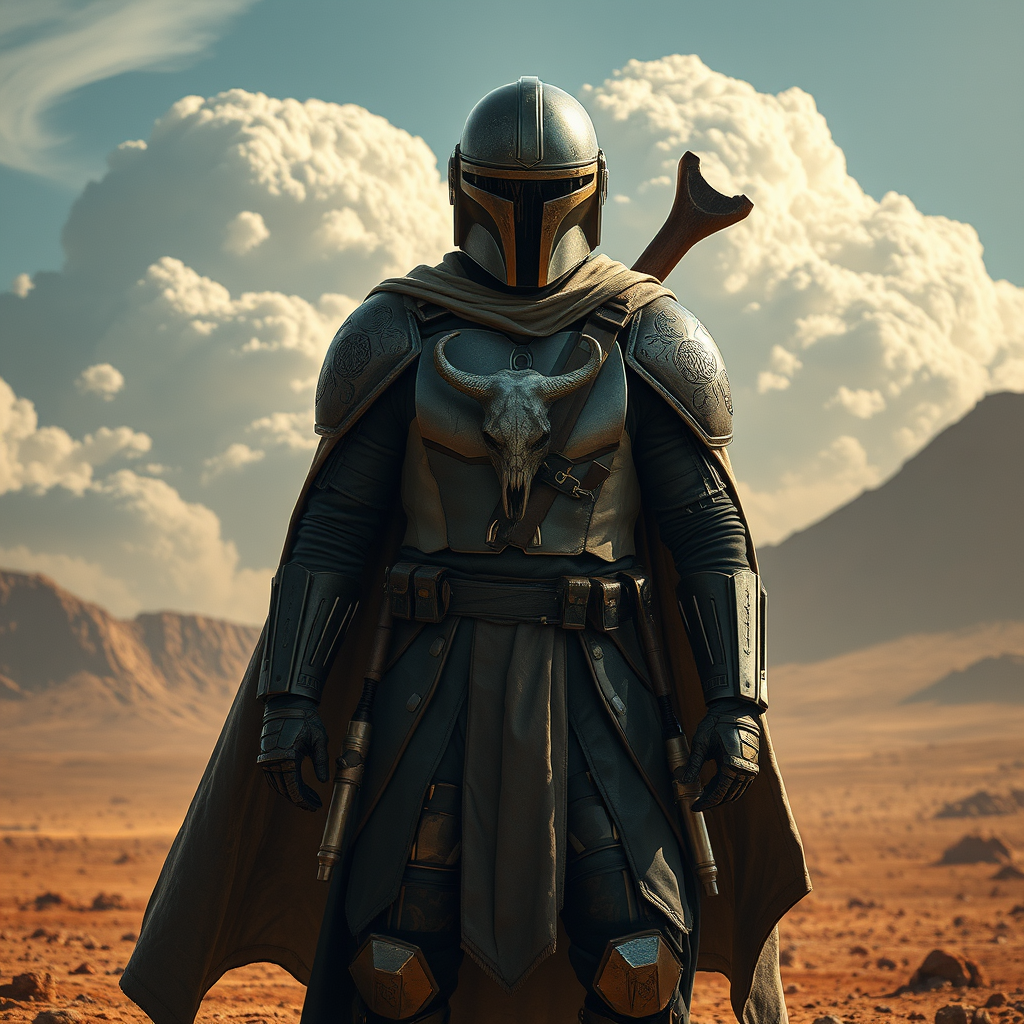 A full body shot of a Mandalorian warrior standing poised in a desolate, otherworldly landscape, character concept art inspired by Roberto Ferri, showcasing a fusion of battle-worn armor and ethereal, flowing cape with intricate engravings. The scene captures an epic shot with dramatic lighting that highlights the warrior's stoic expression under the visor of their iconic helmet. The backdrop features swirling alien clouds, contrasting with the emblematic mythosaur skull emblazoned on the warrior's shoulder pauldron. Intricate details emphasize the textures of weather-beaten metal and the softly glowing energy weapons holstered at the waist, all rendered in breathtaking 4k resolution with UHD clarity, casting long shadows and illuminating the rich, layered environment around the lone figure.
