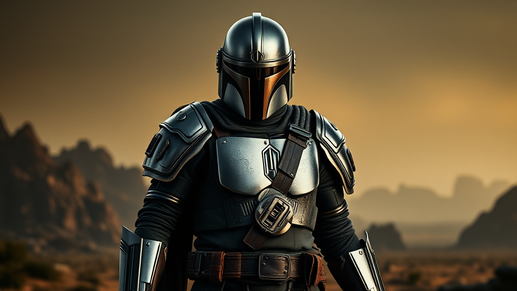 A full body shot of a Mandalorian, wearing intricately detailed armor crafted with the aesthetic nuances of Roberto Ferri's art, featuring a dynamic pose. The scene is rendered in 4k UHD, emphasizing each elaborate element of the armor through dramatic lighting that casts intense shadows and highlights. The setting includes a mystic alien landscape in the background, adding a sense of epic adventure. Subtle modifications like delicate engravings on the armor plates and a unique, slightly more ornate helmet design distinguish this character while preserving the essence of the Mandalorian warrior.