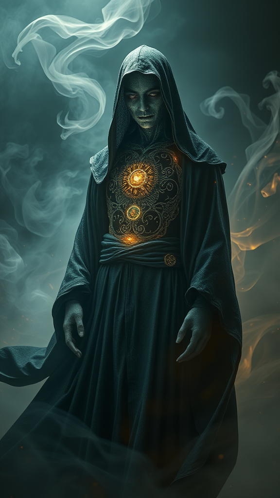 A full body shot of a mysterious void arcanist stands amidst swirling, ethereal mists, their garments flowing with dark, shimmering hues. The hyper-detailed character is enveloped in an aura of magical energy, with intricate patterns glowing faintly on their skin. The scene is rendered with photorealistic precision and depth, using octane render techniques to create ultra-realistic textures and light reflections. Volumetric lighting casts dramatic shadows and highlights the arcanist's enigmatic expression, while the fantasy art setting adds an otherworldly atmosphere, enhancing the sense of mystical allure unique to this realm. The design subtly integrates elements like arcane glyphs and eldritch symbols woven into the fabric, hinting at the character's ancient power and celestial knowledge.