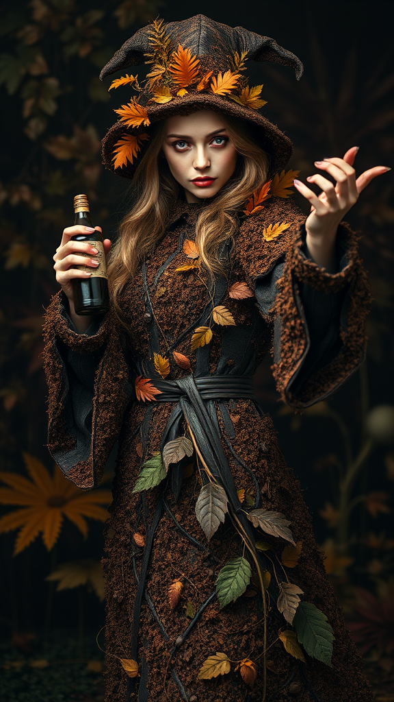 A full-body shot of a slow-motion dance pose, featuring an anatomical, slightly eerie girl wizard composed of autumnal leaves and plants. Her cloak is crafted from brown moss and dark leather, forming intricate and mesmerizing patterns. She holds a bottle of toxic spellcraft, set against a dark, moody universe with a backdrop of various autumn-colored plant matter. The scene is rendered in insanely detailed, high-quality digital art, reminiscent of Chao Teng Zhao's style. The portrait, set in 16k resolution, boasts high sharpness, focusing on the intensely detailed face and eyes, complete with vivid pupils. Her form is photorealistic and perfect, with intricate shadows enhancing her three-dimensional presence in this masterful, realistic concept art.