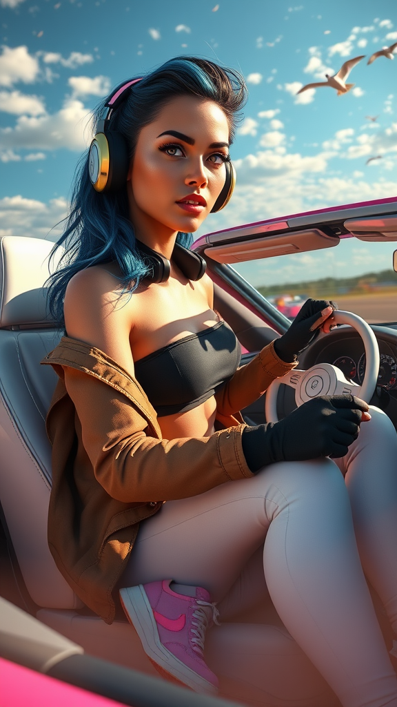 A full body shot of a stunning woman racing enthusiast behind the wheel of a convertible with white seats, showcasing her tanned skin and striking cheekbones. Her mouth slightly open, she sports reflective eyes accentuated by dark eyebrows and mascara. Wearing racing gloves, she navigates through dust particles with intricate, dramatic chiaroscuro lighting highlighting her features. She dons a black crop top beneath an open jacket, paired with white yoga pants and prominent pink sneakers. The scene unfolds on a vibrant race track under a blue sky speckled with white clouds and birds. Artistic influences from the likes of John Constable, Ed Blinkey, Atey Ghailan, Studio Ghibli, Jeremy Mann, Greg Manchess, and Antonio Moro are apparent, creating a piece trending on ArtStation and CGSociety. The imaginative scene features unique elements of Iron Mouse blue hair, adorned with headphones, and a striking pink car, all within a 3D canvas with detailed, vivid colors that maintain excellent proportions and composition, ensuring an impressive and aesthetically pleasing work of art.